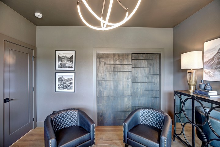The spa-inspired primary suite is a retreat all its own, showcasing a free-standing tub, slab flooring, floating vanity with under-cabinet lighting, and a generous walk-in closet. A second main-floor bedroom has been reimagined into a moody Montana lounge — the perfect spot to relax or entertain.